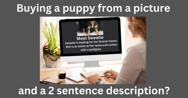 There are hundreds of questionable online puppy mill websites that puppies for sale. It is important to meet the mother dog, see her condition and how she and all of the breeders dogs are treated before you buy a puppy. In person. Never have a puppy shipped to you or meet a breeder in a parking lot. Don’t support puppy mills.