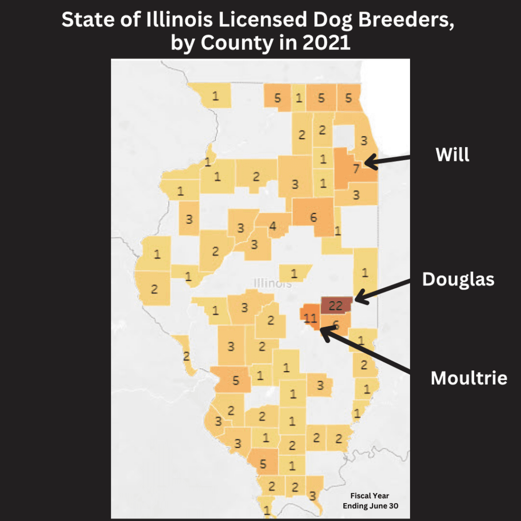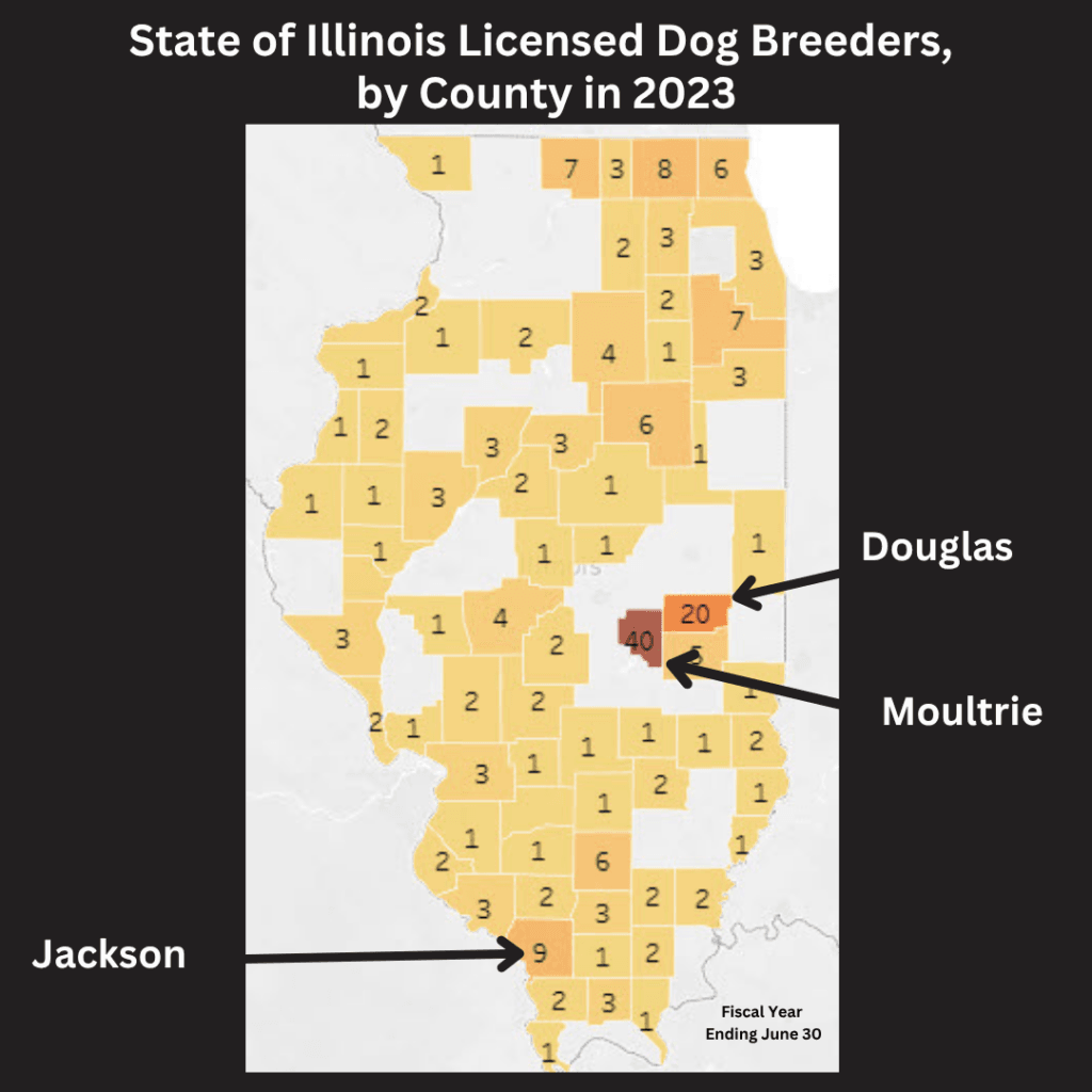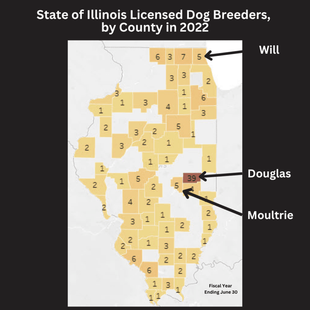 The amount of licensed dog breeders in the Douglas and Moultrie counties tells a story that is consistent with the data from Ohio and Indiana.