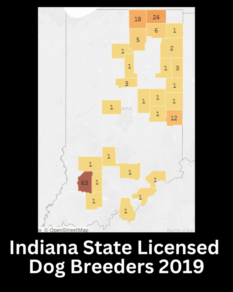 While cultural practices vary, the licensing data shows the majority of Indiana’s licensed commercial dog breeders are located within Amish communities. Dog breeding is a common source of income in these communities where breeding animals for sale is seen as a business, similar to farming. The Indiana data is similar to Ohio Pennsylvania and Illinois.