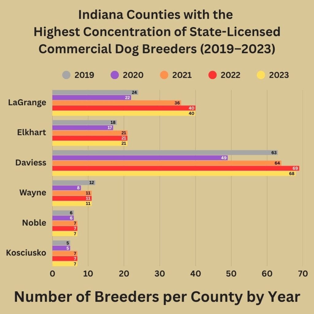 The state licensing data not only shows a steady increase in the number of commercial facilities, it also shows the highest concentrations of high volume commercial dog breeders located in rural regions, particularly the Amish communities of Daviess County in the south and the Shipshewana/LaGrange County area in the north.