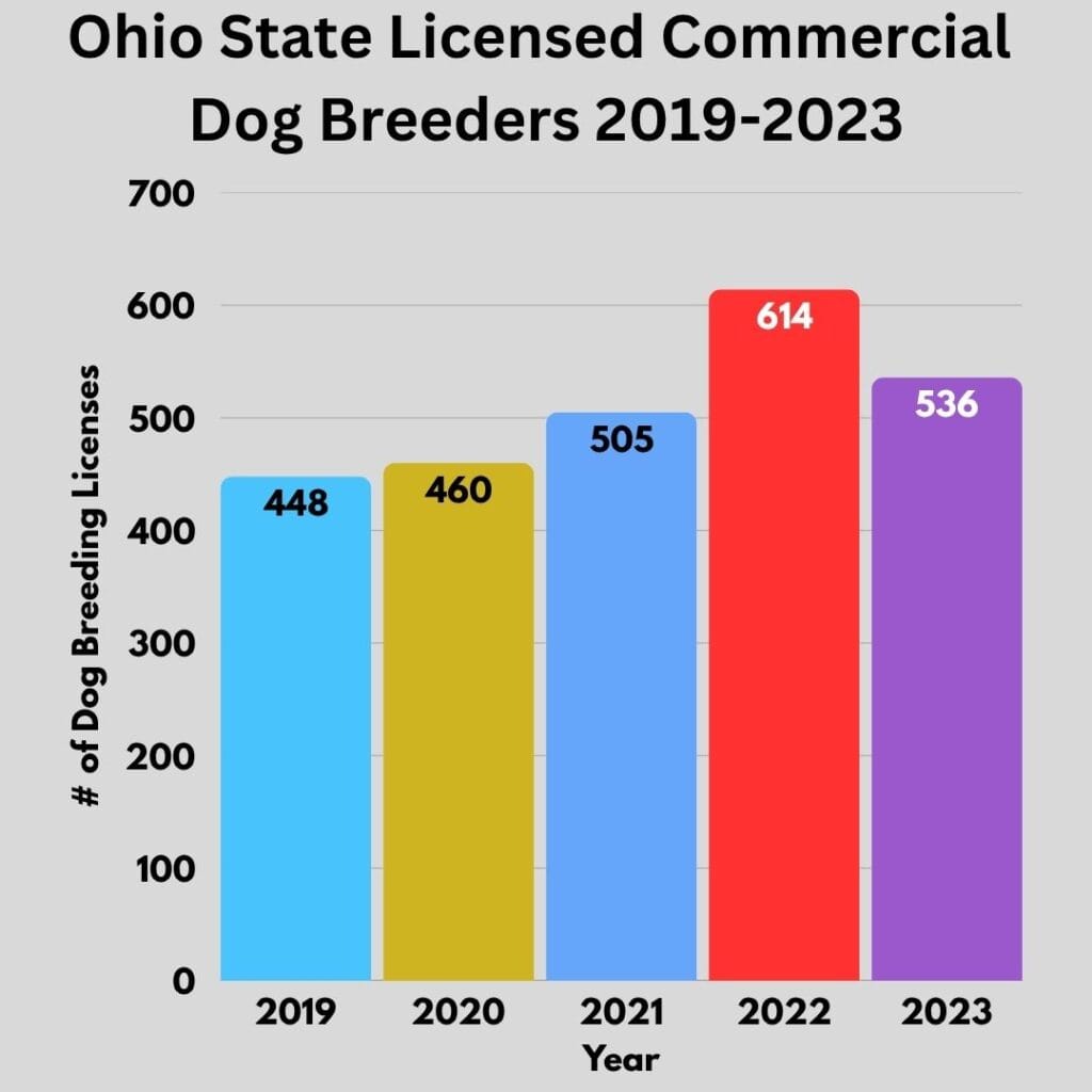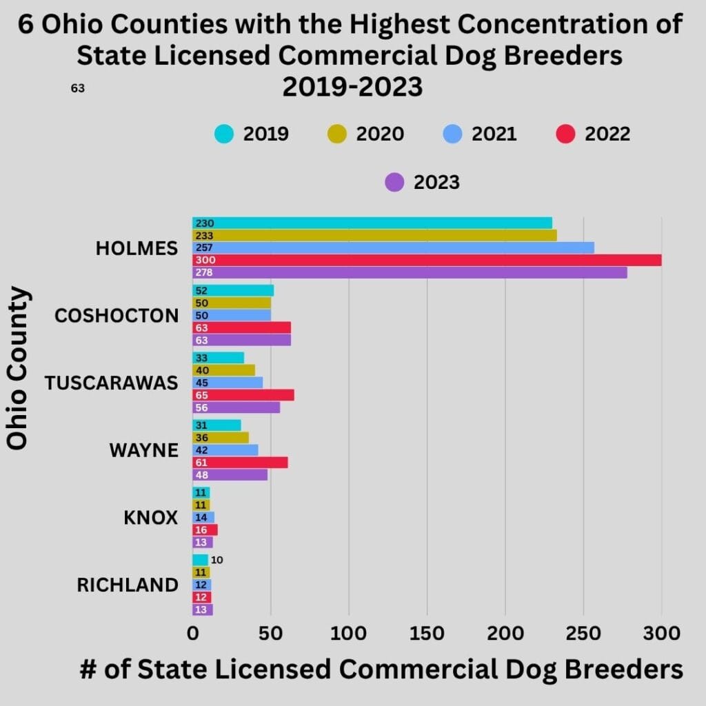 Ohio is a leading state in licensed commercial dog breeding. The 2019 through 2023, state data shows consistently high numbers of licensed commercial dog breeding operations, with highest concentrations year after year in Holmes County followed by Coshocton, Tuscarawas, Wayne, Knox, and Richland. Together, they form a regional cluster of high-volume dog breeding operations in rural Ohio.
