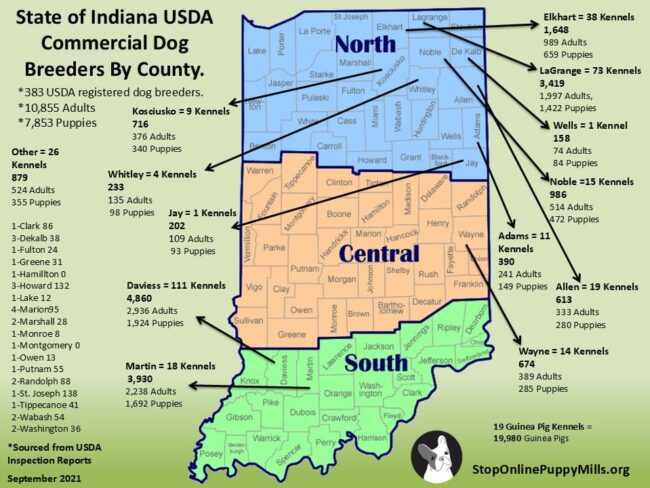 This map shows the locations of USDA licensed commercial dog breeders in Indiana as of September 2021 Stop Online Puppy Mills mapped the dog breeders by county.