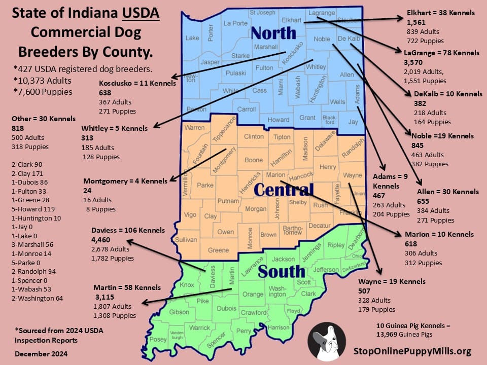 This map illustrates the distribution of USDA-licensed commercial dog breeders across Indiana counties, based on data from December 2024. Sourced from the USDA database, the map uses the most recent inspection reports to display the number of kennels, adult dogs, and puppies in each county.
